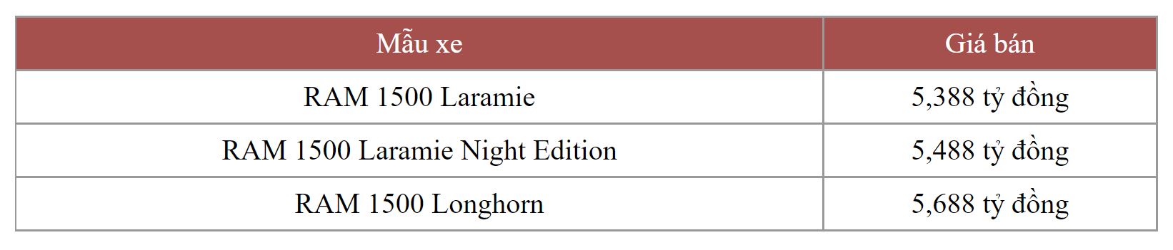 RAM 1500 sẽ là mẫu xe đầu tiên của thương hiệu RAM bán ra thị trường Việt Nam. Mẫu xe bán tải cỡ lớn này được phân phối dưới 3 phiên bản là Laramie, Laramie Night Edition và Longhorn.