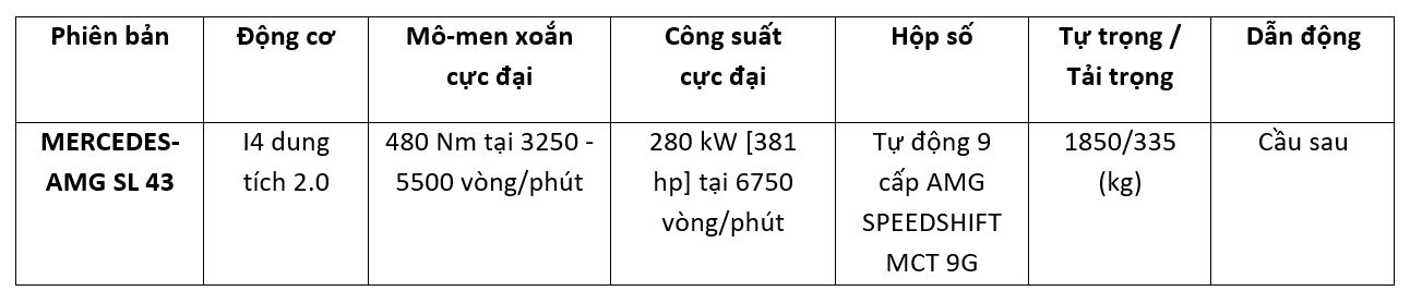 Bên dưới nắp ca-po của mẫu xe SL 43 mui trần Roadster 2+2 chỗ ngồi là khối động cơ xăng 4 xi-lanh thẳng hàng với dung tích 2L mới sở hữu công nghệ 48V mild-hybrid được lắp ráp theo triết lý “One man, One engine”. Hệ thống động cơ trên SL 43 là sản phẩm kế thừa trực tiếp từ quá trình phát triển đã được Đội đua F1 Mercedes-AMG Petronas sử dụng thành công trong nhiều năm ở giải đua xe thể thao hạng nhất. Sự cải tiến trong quá trình tăng áp động cơ ô tô đảm bảo phản ứng nhanh trong toàn bộ dải vòng tua, qua đó tăng cường hiệu suất hoạt động của xe và đem lại trải nghiệm lái phấn khích và thể thao hơn.