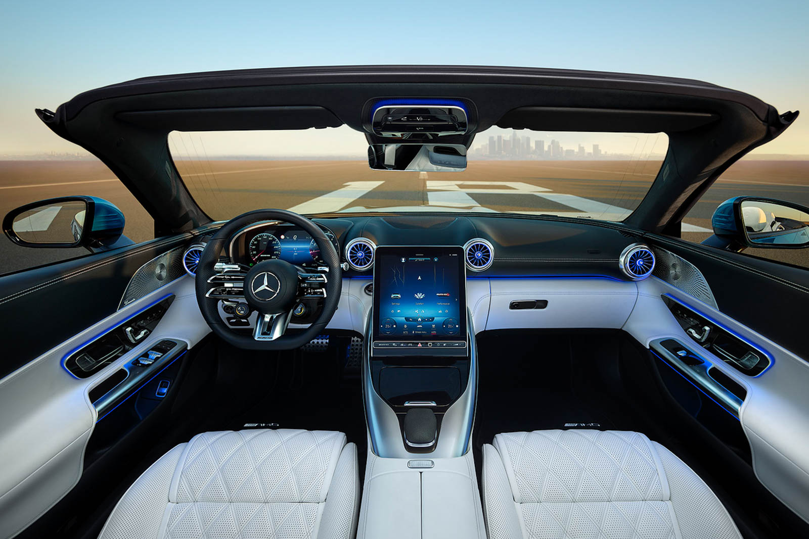 Nội thất của mẫu xe mui trần Mercedes-AMG SL 43 mới là sự kết hợp tuyệt vời giữa hình học analog và thế giới kỹ thuật số, được gọi là “Hyperanalog”. Điều này được thể hiện qua bảng đồng hồ kỹ thuật số được tích hợp vào tấm che kính 3D. Hệ thống giải trí MBUX thế hệ mới với màn hình cảm ứng trung tâm 11,9-inch cung cấp nhiều kiểu hiển thị cụ thể và các chế độ khác nhau. Bảng đồng hồ kỹ thuật số sau vô lăng với màn hình màu 12,3-inch được thiết kế như một cánh gió mạnh mẽ tích hợp vào một tấm che công nghệ cao để ngăn hiện tượng phản chiếu do ánh sáng mặt trời. Để tránh phản chiếu ánh sáng gây phiền toái do các vị trí nắng khác nhau khi mở mui mềm, độ nghiêng của màn hình cảm ứng trên bảng điều khiển trung tâm cũng có thể được điều chỉnh bằng điện từ 12 độ đến 32 độ.