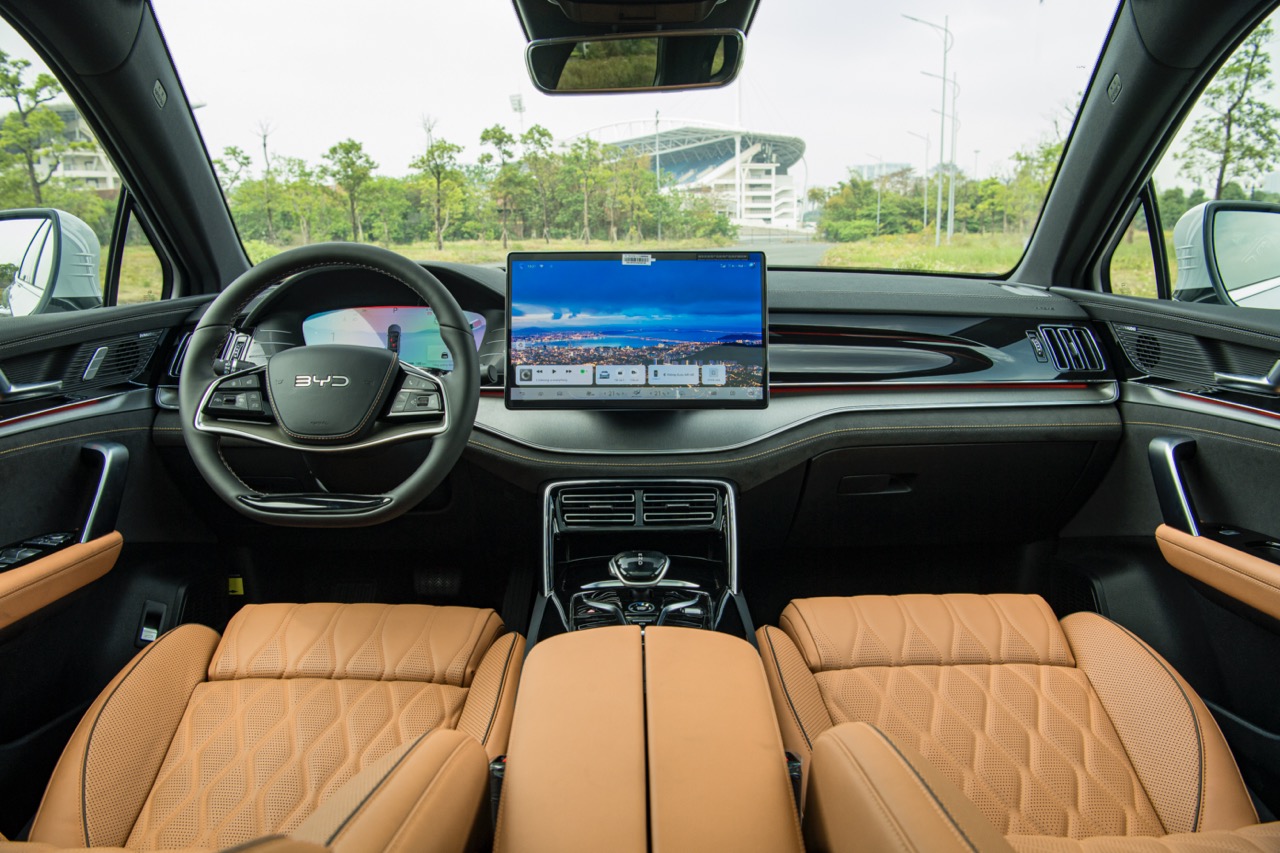 Nội thất của BYD Sealion 8 là không gian 7 chỗ rộng rãi, hàng ghế thứ hai và ba có thể gập phẳng để mở rộng khoang hành lý từ 940 L lên đến 2.050 L. Trái tim của khoang lái là màn hình trung tâm cảm ứng xoay 15,6 inch, hỗ trợ điều khiển đa hướng. Xe vận hành trên nền tảng DiPlatform, tích hợp hệ sinh thái DiEcology thông minh với khả năng ra lệnh bằng giọng nói, điều khiển hệ thống điều hòa, định vị, giải trí…