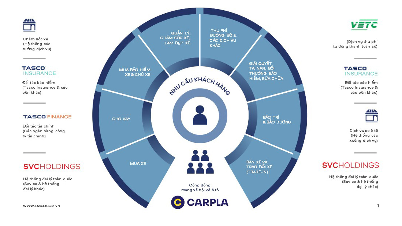 Là một đơn vị thành viên của Tasco, Carpla là mảnh ghép quan trọng giúp hoàn thiện chuỗi dịch vụ trọn vòng đời phương tiện, cụ thể: mua xe mới, mua/bán xe cũ, dịch vụ phụ tùng, sửa chữa, làm đẹp xe, bảo hiểm, cho vay, đổi xe cũ lấy xe mới, nâng cấp xe từ xe phổ thông qua xe sang, dịch vụ thu phí không dừng, bãi đậu xe, thanh toán xăng dầu, các loại phí bảo trì đường bộ…, các sản phẩm và dịch vụ khác liên quan tới xe và chủ xe.