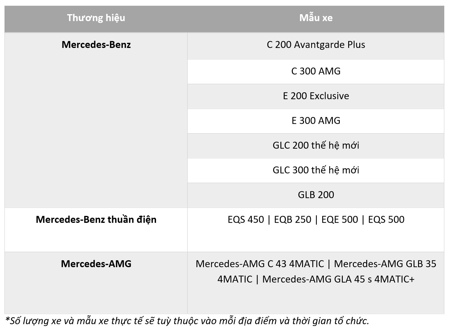 Ngoài những dòng xe chủ lực như GLC, C-Class và E-Class, MBV sẽ đồng hành cùng NPP để mang đến cho khách hàng dàn xe sang đa dạng nhất, bao gồm những mẫu xe đặc biệt như AMG hiệu năng cao, hay những mẫu xe EQ thuần điện vừa ra mắt trong tháng 09.2023. Cụ thể như sau: