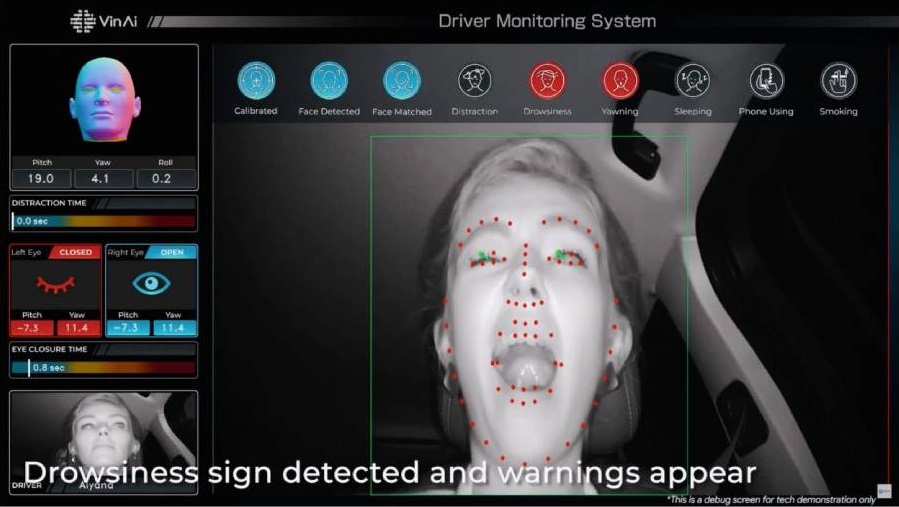 Khách tham dự đã được trực tiếp trải nghiệm 2 công nghệ mới này của VinAI tích hợp trên chiếc ô tô điện thông minh VF e34 của VinFast. Hệ thống Giám sát người lái là giải pháp của VinAI sử dụng camera hồng ngoại và hệ thống cảm biến trên xe để nhận biết các trạng thái của người lái như buồn ngủ, mệt mỏi, những hành vi nguy hiểm như mất tập trung hay sử dụng điện thoại, nhằm kịp thời đưa ra cảnh báo với các cấp độ khác nhau trong suốt hành trình. Đặc biệt, hệ thống giám sát có thể hoạt động tốt cả khi tài xế đeo kính râm hoặc trong điều kiện ban đêm với ánh sáng yếu.