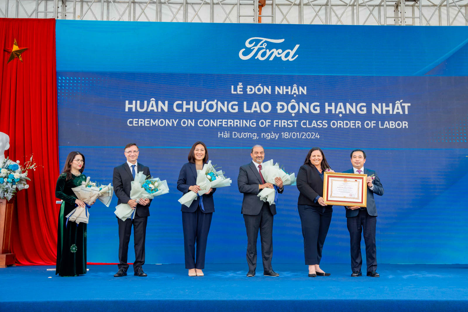 Hôm nay ngày 18 tháng 01 năm 2024, Ford Việt Nam tổ chức Lễ đón nhận Huân chương Lao động hạng Nhất tại nhà máy Ford Hải Dương. Tham dự buổi lễ có đại diện lãnh đạo các cơ quan bộ ngành trung ương và địa Phương, bao gồm Bí Thư Tỉnh Ủy tỉnh Hải Dương, Thứ trưởng các Bộ Kế hoạch Đầu tư, Công Thương, Giao Thông, Đại sứ Mỹ tại Việt Nam và bà Kay Hart, Chủ tịch Ford khu vực thị trường quốc tế, cùng nhiều vị đối tác, khách quý. Ford Việt Nam được coi là biểu tượng của sự hợp tác, đồng hành phát triển mối quan hệ giữa Việt Nam và Hoa Kỳ.
