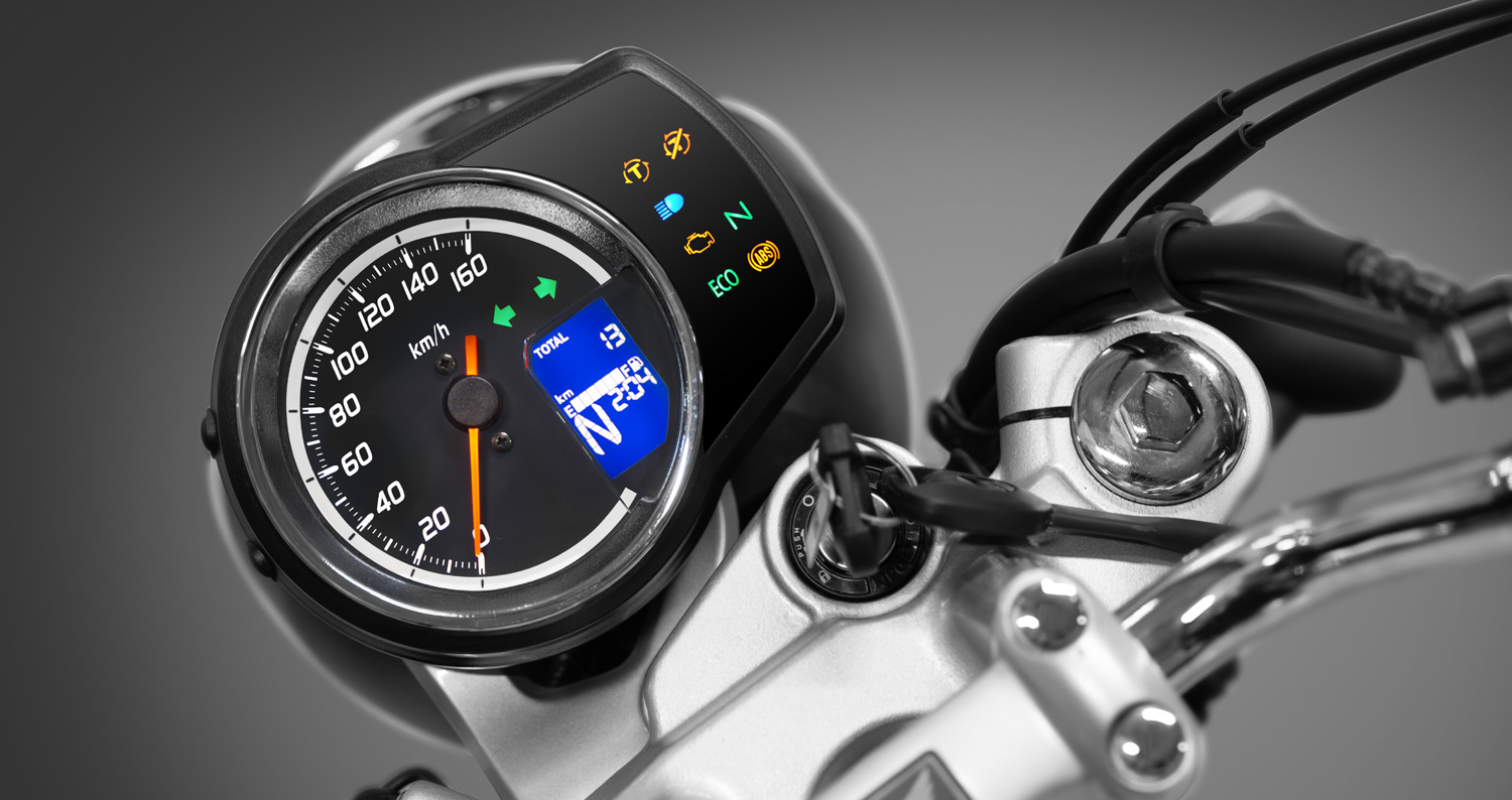 Đồng hồ LCD đa chức năng trên Honda CB350 H’ness mang đến sự hòa quyện giữa cổ điển và hiện đại, với kim cơ hiển thị tốc độ kết hợp màn hình LCD đa chức năng, cung cấp đầy đủ thông tin từ lượng xăng và giờ, vị trí cấp số, mức tiêu thụ nhiên liệu trung bình, mức tiêu thụ nhiên liệu theo thời gian thực, điện áp ắc quy và quãng đường đi được với lượng xăng còn lại trong bình.