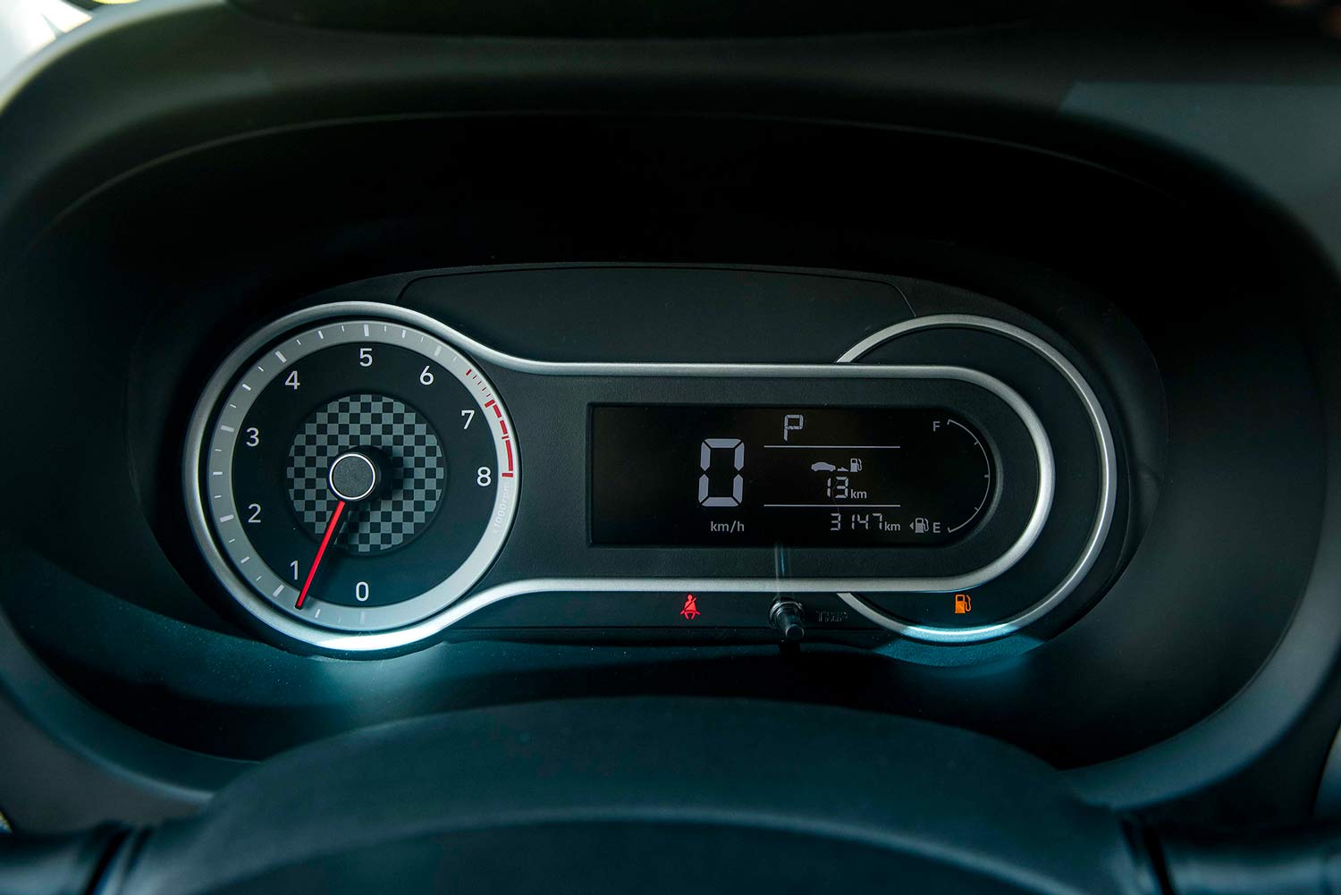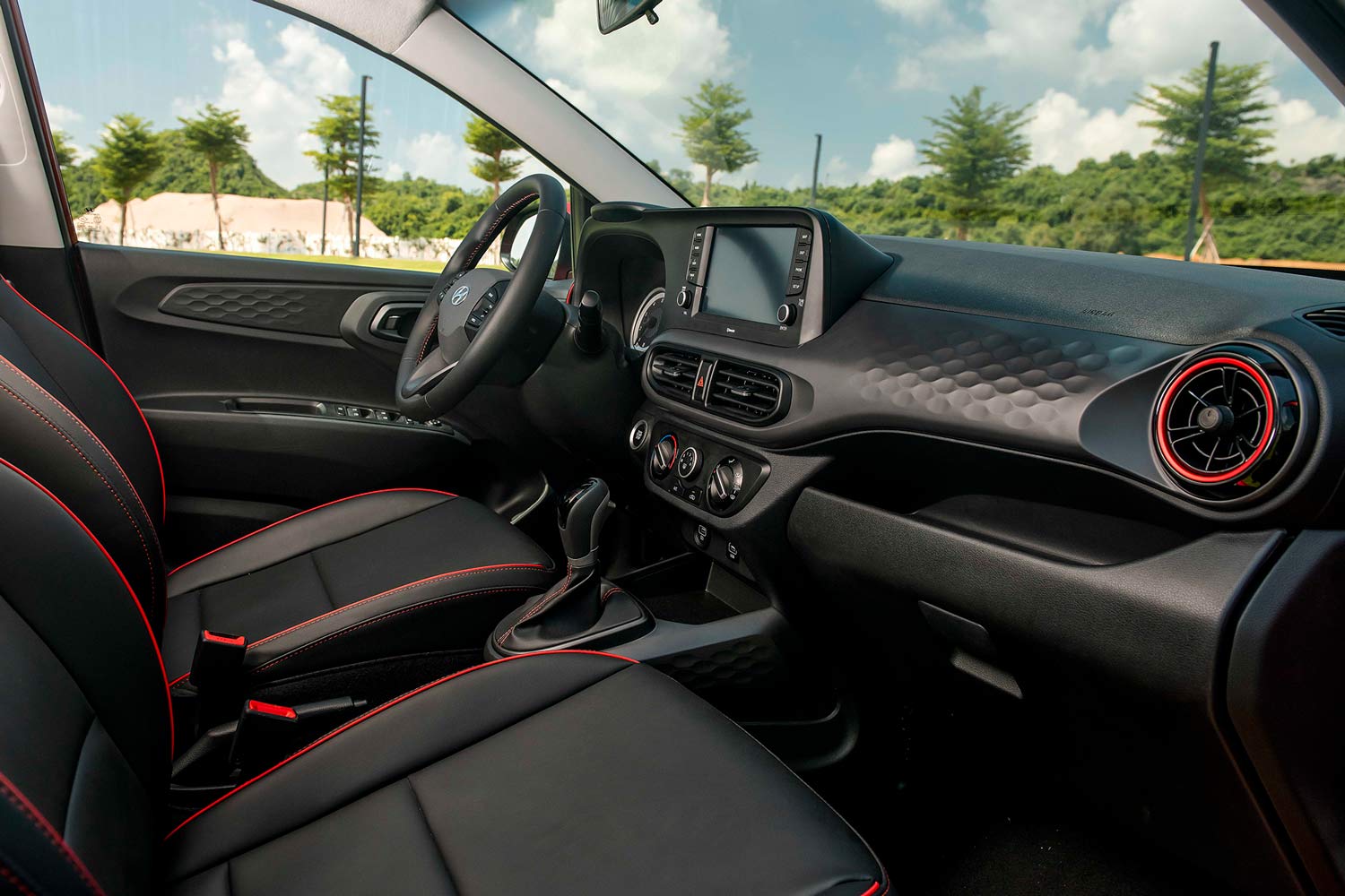 Nội thất Grand i10 thế hệ hoàn toàn mới được bọc da màu tối, kết hợp cùng đường viền màu đỏ làm nên phong cách trẻ trung và thể thao. Màn hình ODO của xe là loại semi-digital với màn hình thông tin dạng TFT kích thước 5,3 inch. Những tính năng nổi bật có thể thấy như nút bấm khởi động Start/Stop engine, chìa khóa thông minh Smartkey, vô lăng điều chỉnh 4 hướng tích hợp phím chức năng, kiểm soát hành trình Cruise Control, sấy kính trước & sau, cửa sổ chỉnh điện chống kẹt, ghế sau phiên bản hatchback có khả năng gập hoàn toàn tạo mặt phẳng.