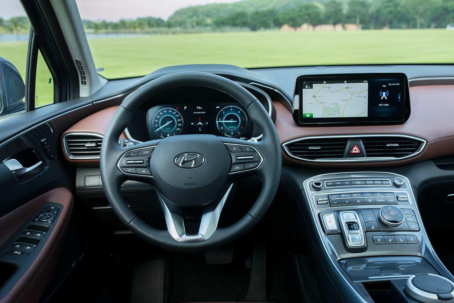 Hyundai Santa Fe 2021 sở hữu một không gian nội thất sang trọng với các đường gân mạnh mẽ tạo thành kết cấu khung vòm liền mạch cho khoang lái. Nguyên lý thiết kế nội thất HMI (Human Machine Interface) được áp dụng và nâng lên một tầm cao mới giúp Santa Fe sở hữu không gian nội thất đẳng cấp, tiện nghi nhưng vẫn hoàn toàn dễ sử dụng nhất trong phân khúc.