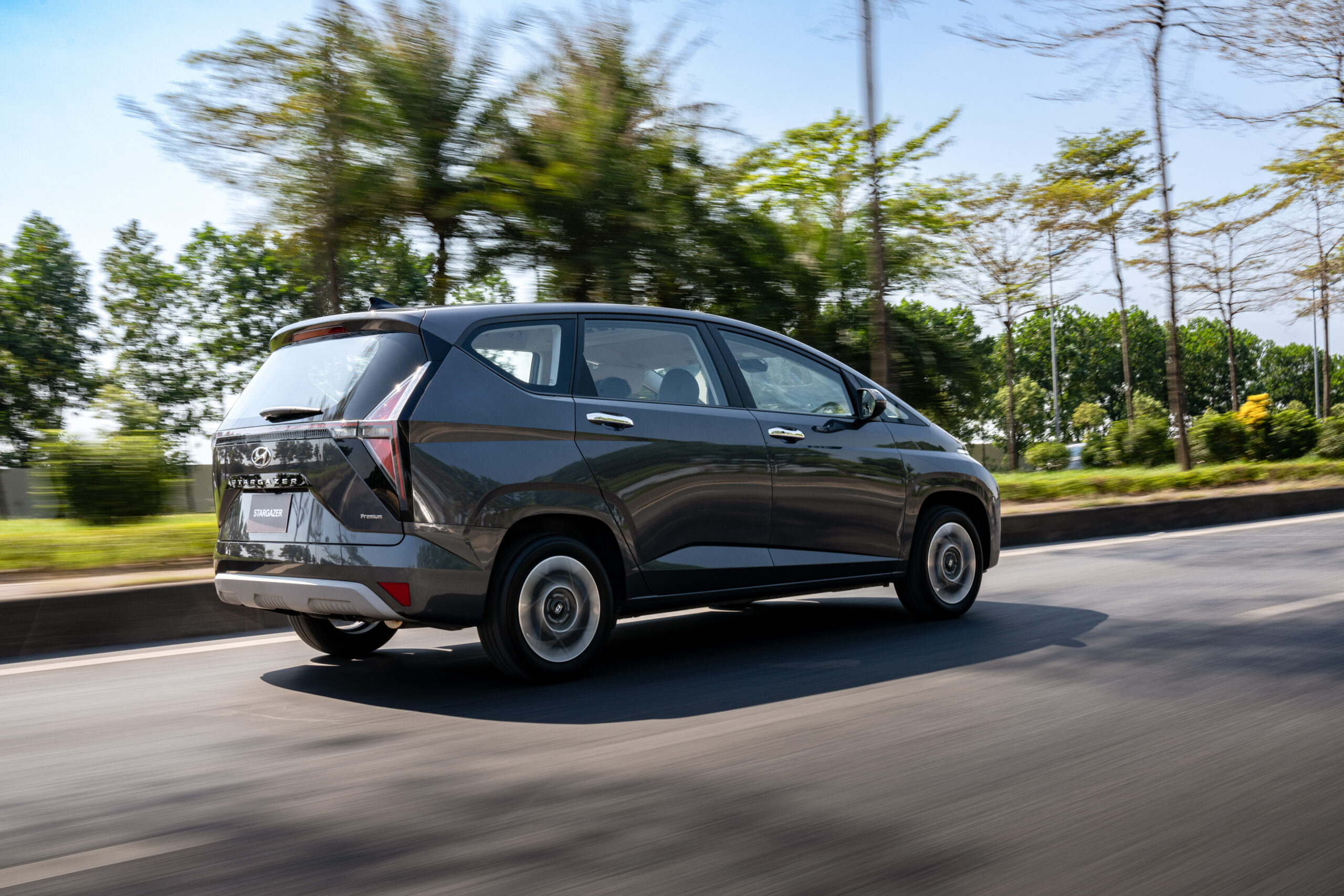 Ở hai bên hông, Stargazer sở hữu vòm bánh xe vuông vức, mâm xe hợp kim kích thước 16 inch Diamond Cut cùng kích cỡ lốp loại 205/55 R16. Ở phía sau, cụm đèn hậu tạo hình tam giác, kết hợp với kính chắn gió phía sau và được nối liền với nhau thông qua một thanh đèn LED tạo thành logo chữ H khổng lồ di động. Xe còn được trang bị đèn phanh trên cao dạng LED. Các điểm nhấn đáng chú ý khác bao gồm tay nắm cửa mạ Crom tích hợp nút bấm đóng/mở khóa thông minh, gương chiếu hậu tích hợp xi-nhan…