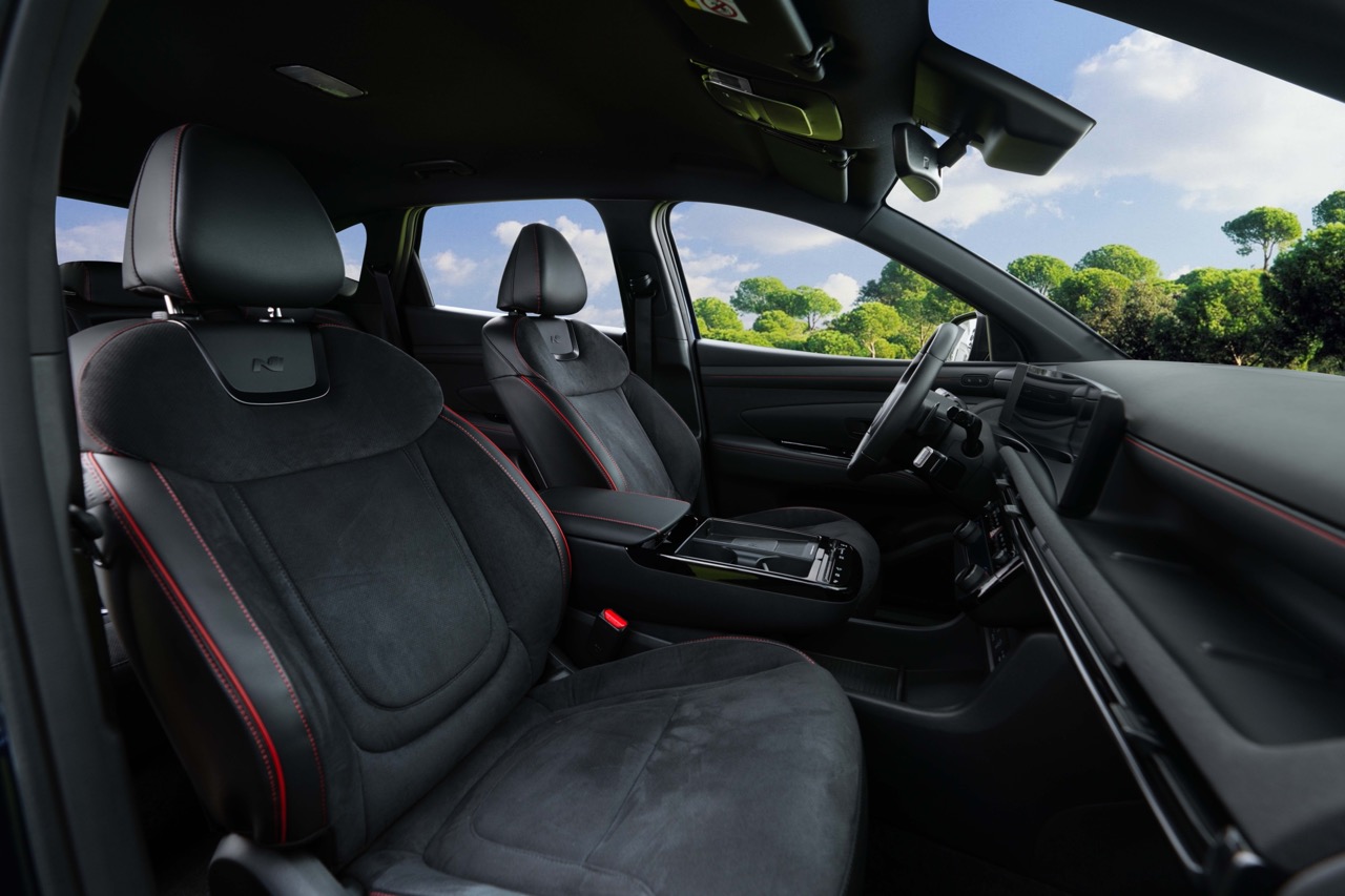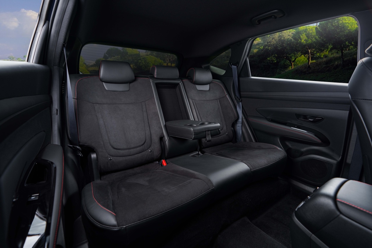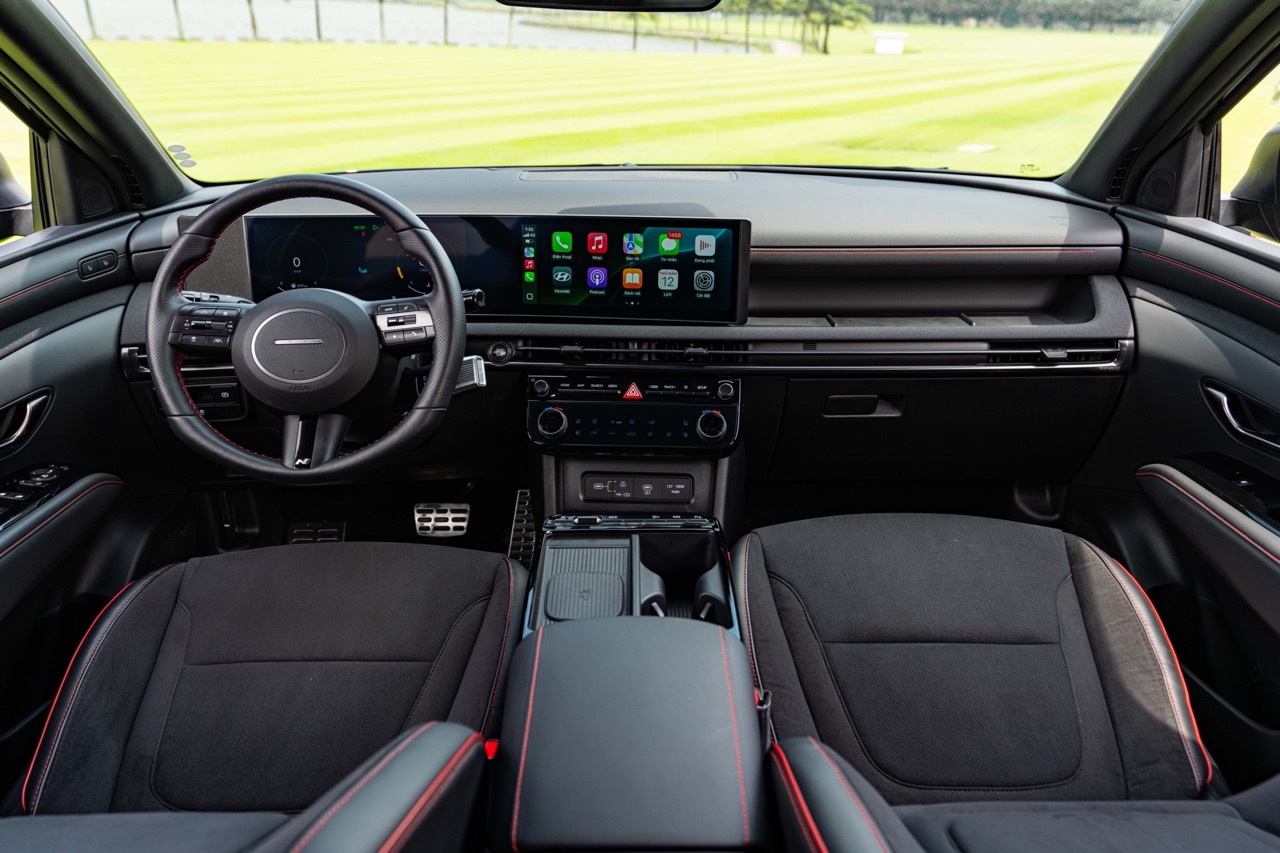 Không gian nội thất của Hyundai Tucson N Line 2025 cũng ấn tượng tính chất motorsport với ghế da thể thao kết hợp với các đường chỉ khâu màu đỏ nổi bật. Ghế ngồi của Tucson N Line là sự kết hợp của vật liệu da và vải dệt Fabric với ưu điểm thoáng khí, hạn chế hấp thụ nhiệt khi dừng xe dưới trời nắng nóng, đồng thời dễ bảo dưỡng, hạn chế bong, vỡ da.