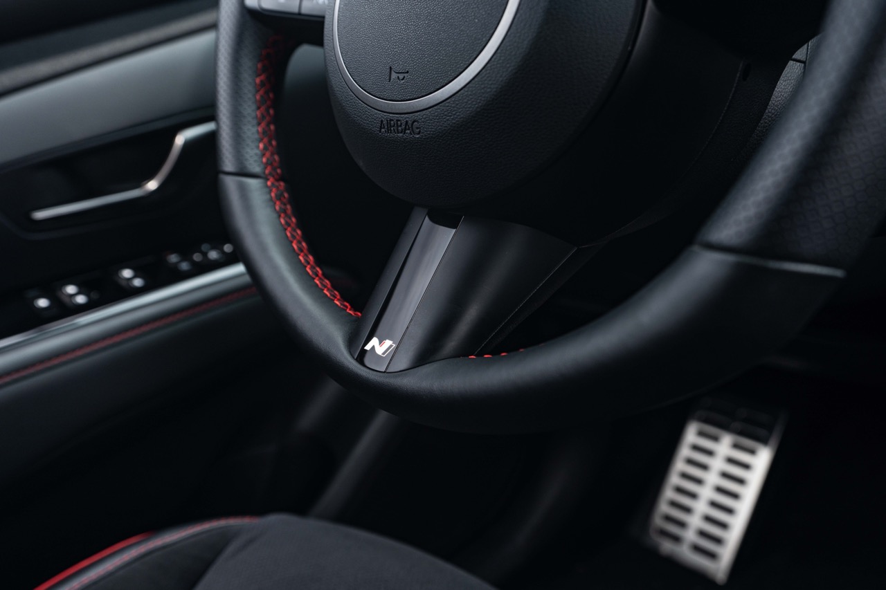 Lưng ghế của xe cũng được khắc logo N Line tạo dấu ấn nổi bật. Chân ga, chân phanh và điểm đặt chân của Tucson N Line được bọc inox sáng.