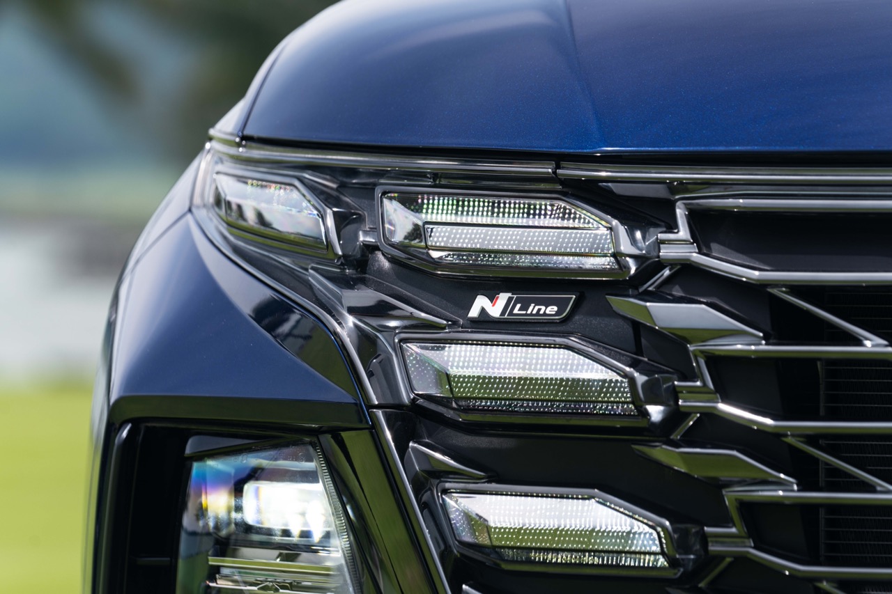 Logo N Line được xuất hiện giữa dải LED DRL trên mặt cản trước một góp phần làm nên dấu ấn đặc trưng cho Tucson phiên bản phong cách thể thao này. Cụm đèn chiếu sáng của Tucson N Line được trang bị cấu hình LED Projector với công nghệ AHB – Auto High Beam với 16 cụm LED bật tắt theo vùng ánh sáng tránh gây chói mắt cho xe ngược chiều.