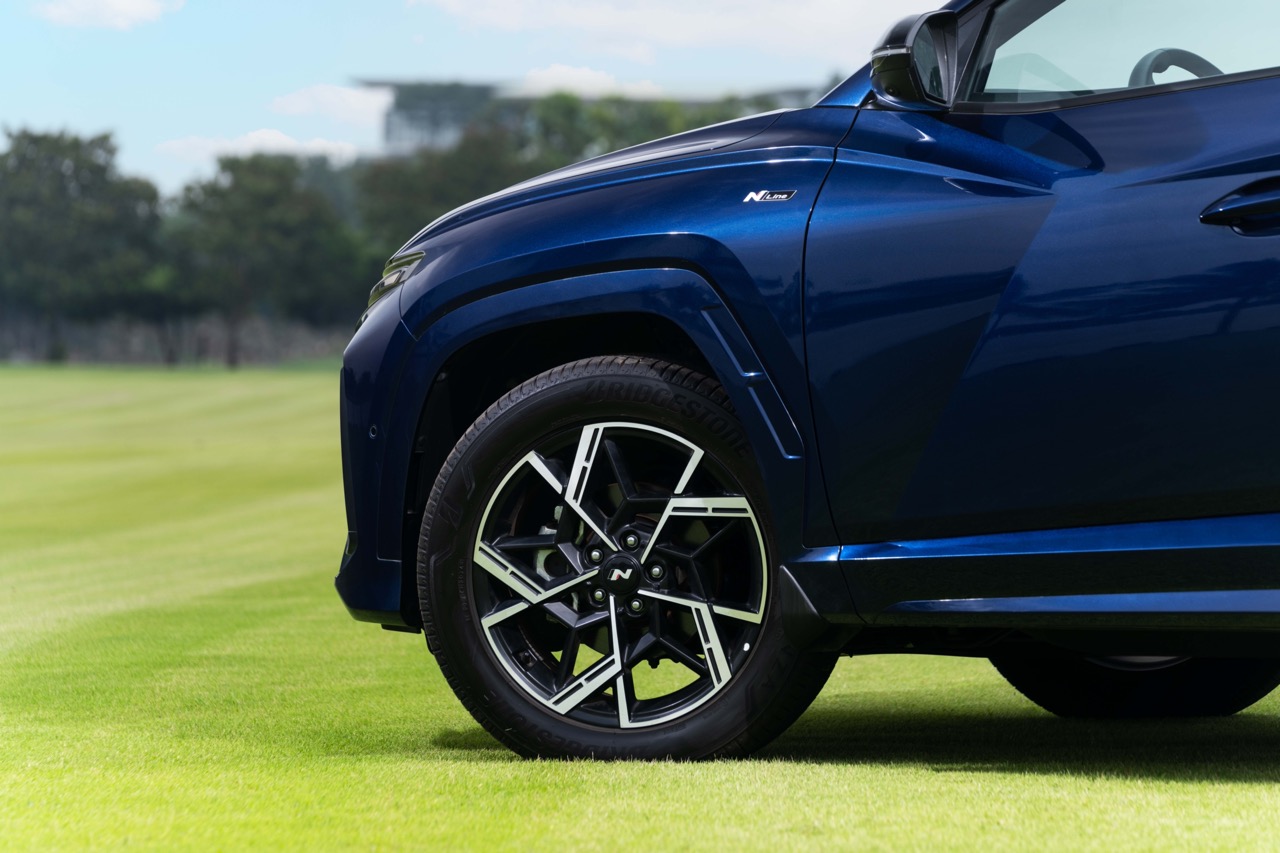 Hông xe cũng được trang bị logo N Line ở phía dưới gương chiếu hậu. Đặc biệt, lazang của xe có kích thước 19 inch được thiết kế riêng của dòng N Line với logo N ở giữa, tạo nên hiệu quả thị giác ấn tượng cho xe, đặc biệt khi lăn bánh. Thông số lốp vẫn giữ ở mức 235/55 R19 giống với phiên bản Tucson Turbo.