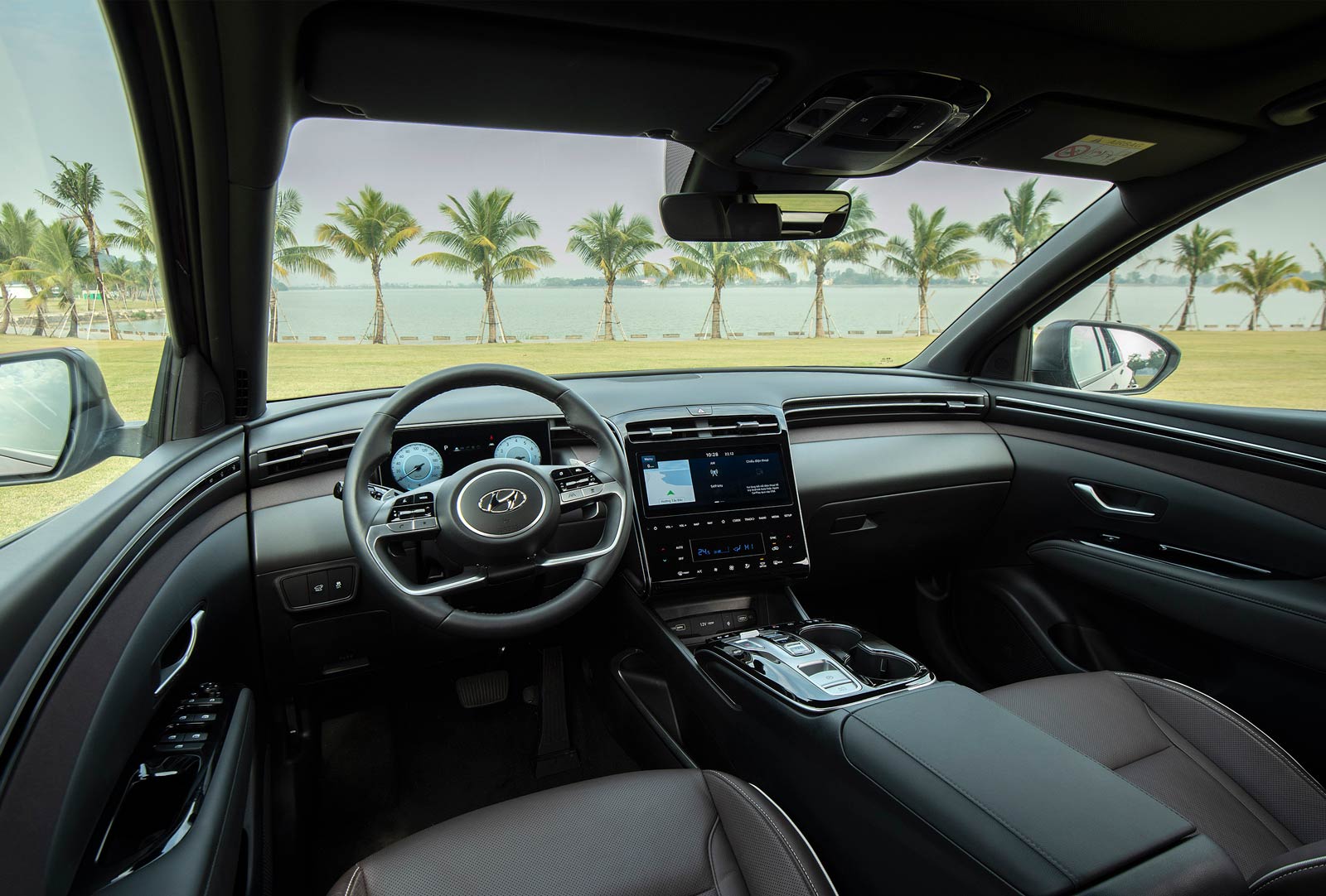Đáng chú ý trong nội thất Tucson 2022 là khu vực bảng điều khiển trung tâm với màn hình cảm ứng giải trí đa chức năng 10,25 inch, hỗ trợ Android Auto/Apple Carplay cùng khả năng Dual Connect 2 thiết bị Bluetooth cùng lúc. Bảng điều khiển sử dụng công nghệ cảm ứng sắp xếp theo chiều dọc đổ tạo cảm giác như một thác nước tuôn chảy. Đường trang trí màu bạc chạy dọc từ trung tâm đến cửa sau hài hòa với các vật liệu bề mặt cao cấp được xếp lớp gọn gàng. Xe được trang bị hệ thống đèn LED nội thất, có thể điều chỉnh 64 màu giúp làm tăng thêm tính thẩm mĩ cho không gian.