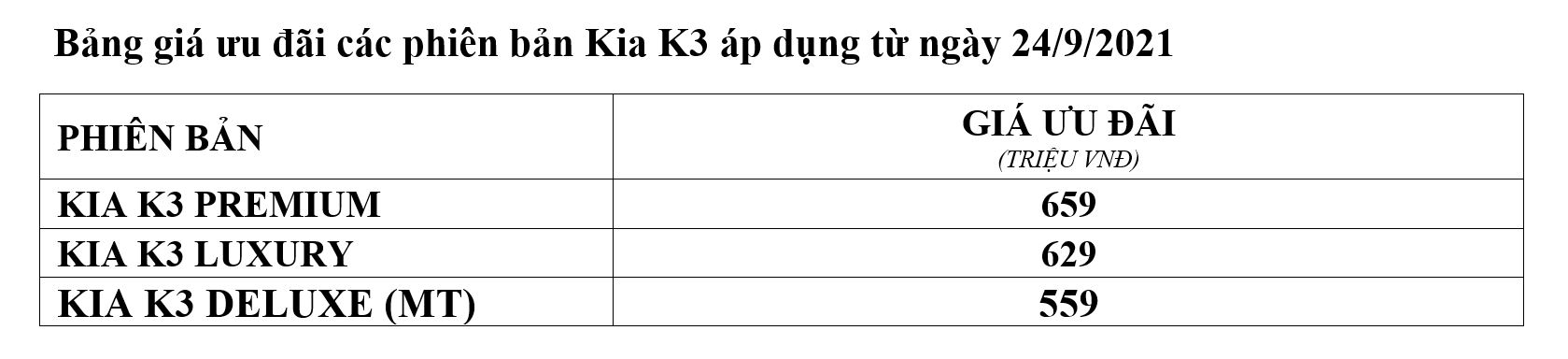 Tại Việt Nam, Kia K3 2021 được giới thiệu trước với 3 phiên bản K3 1.6 Premium, K3 1.6 Luxury và K3 1.6 Deluxe (MT). Trong đó phiên bản K3 Premium là phiên bản hoàn toàn mới so với mẫu xe tiền nhiệm.