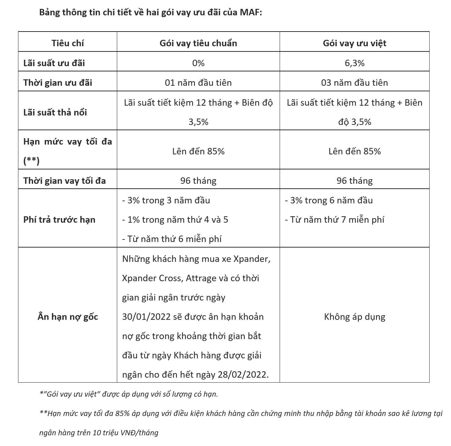 “Gói vay tiêu chuẩn” giúp khách hàng có thể mua xe với chi phí ban đầu chỉ tương đương 15% giá trị xe trả trước và miễn hoàn toàn lãi suất trong suốt năm đầu tiên. Ngoài ra, khách hàng hoặc Attrage được ưu đãi thêm ân hạn nợ gốc “Không đồng không lãi suất” đến hết tháng 02/2022 khi mua các dòng xe mua xe Xpander, Xpander Cross.