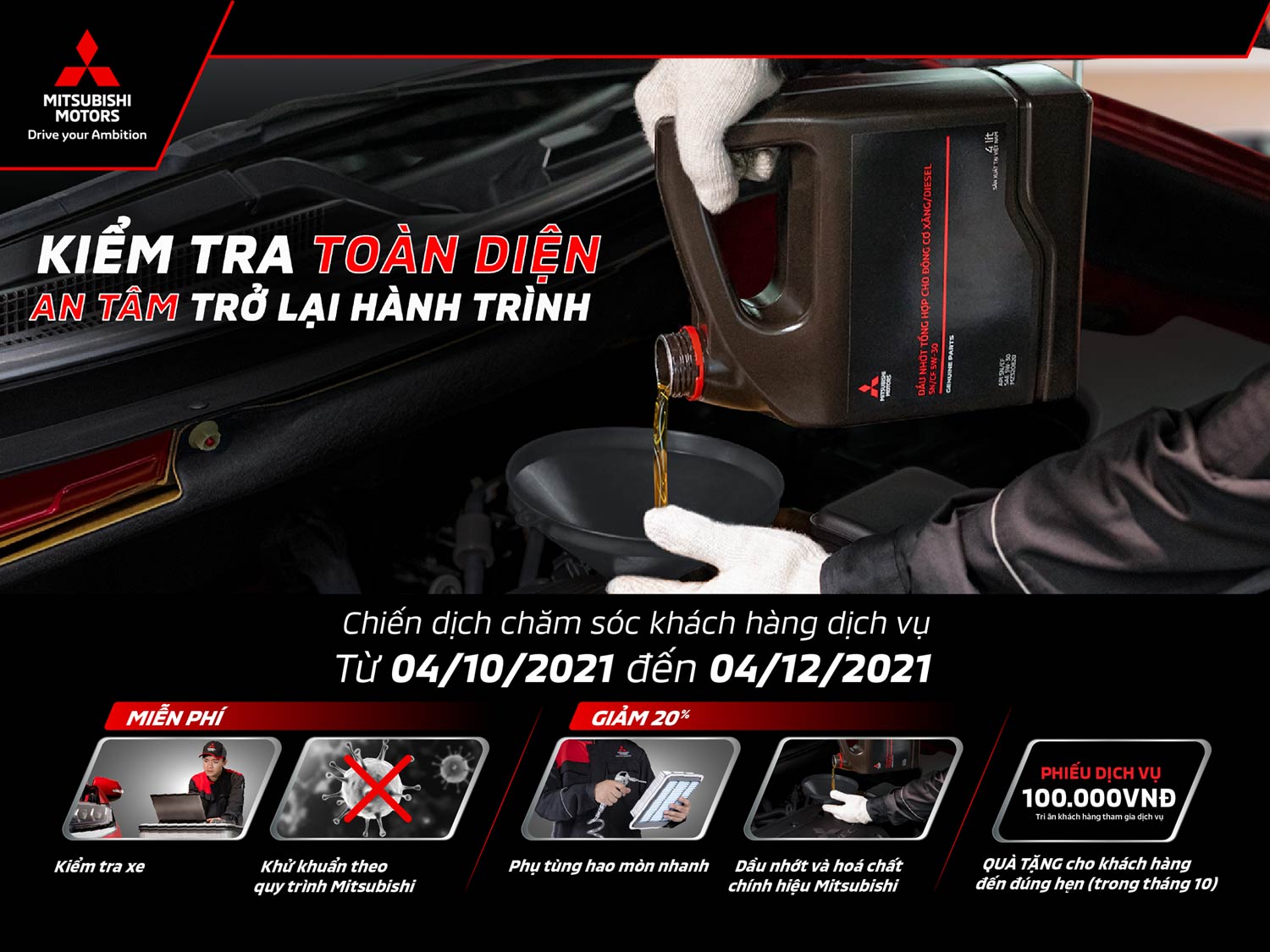 Bên cạnh đó, Mitsubishi Motors Việt Nam phối hợp với nhà phân phối (NPP) ủy quyền trên toàn quốc cung cấp dịch vụ kịp thời tới những khách hàng có nhu cầu kiểm tra, khử khuẩn hay bảo dưỡng, sữa chữa xe ít hoặc không được sử dụng đến trong một thời gian dài do giãn cách xã hội. Cụ thể, khách hàng sẽ nhận được những ưu đãi sau: