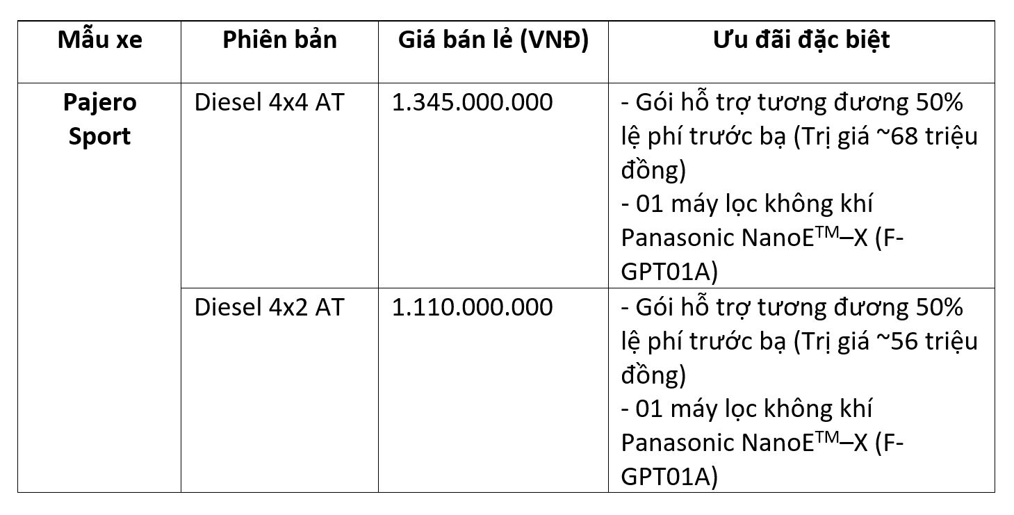 Với mục tiêu giúp cho khách hàng dễ dàng tiếp cận các mẫu xe của Mitsubishi, MMV mang đến gói ưu đãi hỗ trợ lệ phí trước bạ với giá trị tương đương 50% cho các dòng xe Pajero Sport, Xpander, Xpander Cross, Attrage và Outlander trong tháng 7/2021. Bên cạnh đó, khách hàng sẽ được tặng thêm một “Máy phát NanoeTM X lọc không khí và khử mùi” có khả năng ức chế vi khuẩn, virus khi mua xe. Các chương trình lái thử, dịch vụ lưu động của MMV sẽ tiếp tục được triển khai trong tháng để đáp ứng nhu cầu của khách hàng một cách thuận tiện và an toàn.