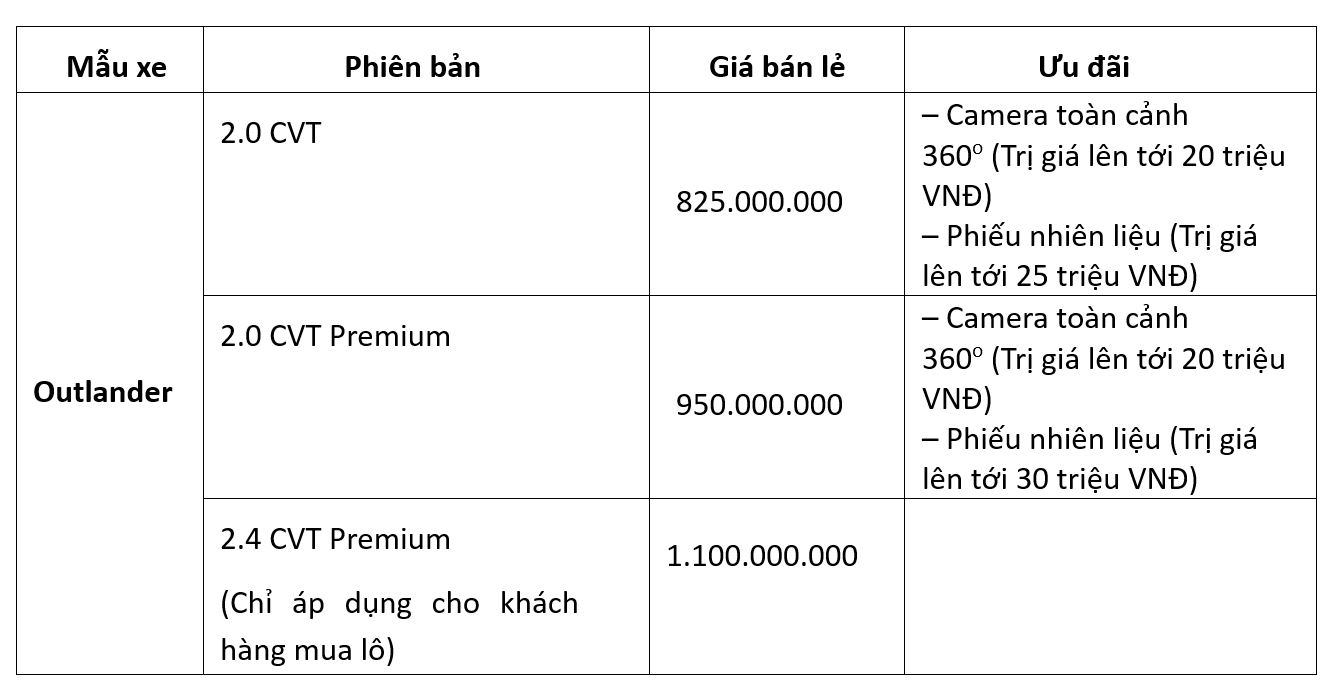 Outlander là mẫu xe có ưu đãi hấp dẫn nhất khi tổng giá trị quà tặng lên đến 50 triệu đồng. Cụ thể, khách hàng mua xe Outlander sẽ được tặng ưu đãi kép gồm Camera toàn cảnh 360 độ trị giá 20 triệu đồng và phiếu nhiên liệu trị giá 25 triệu đồng cho phiên bản 2.0 CVT. Phiên bản 2.0 CVT Premium cũng được tặng camera 360 độ nhưng đi kèm phiếu nhiên liệu 30 triệu đồng.