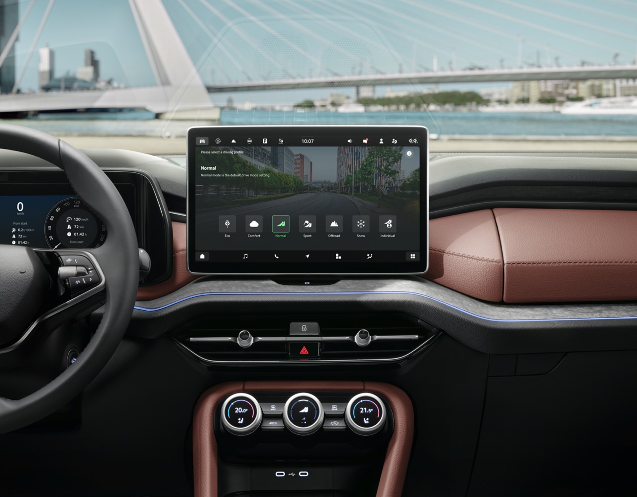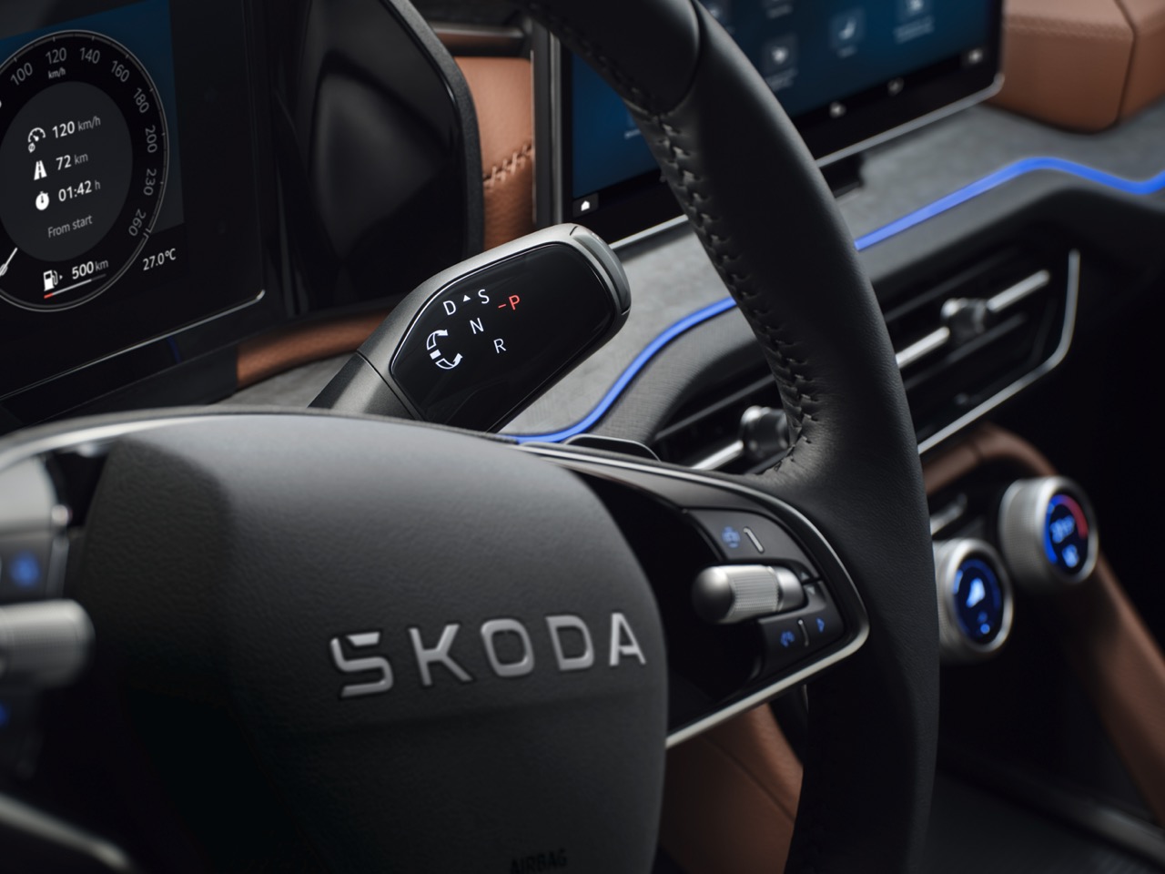 Nội thất Skoda Kodiaq 2025 được thiết kế mới hoàn toàn theo hướng tối giản và sang trọng. Phiên bản Premium sử dụng 2 tùy chọn da màu đen Suite Black và màu nâu Suite Cognac.