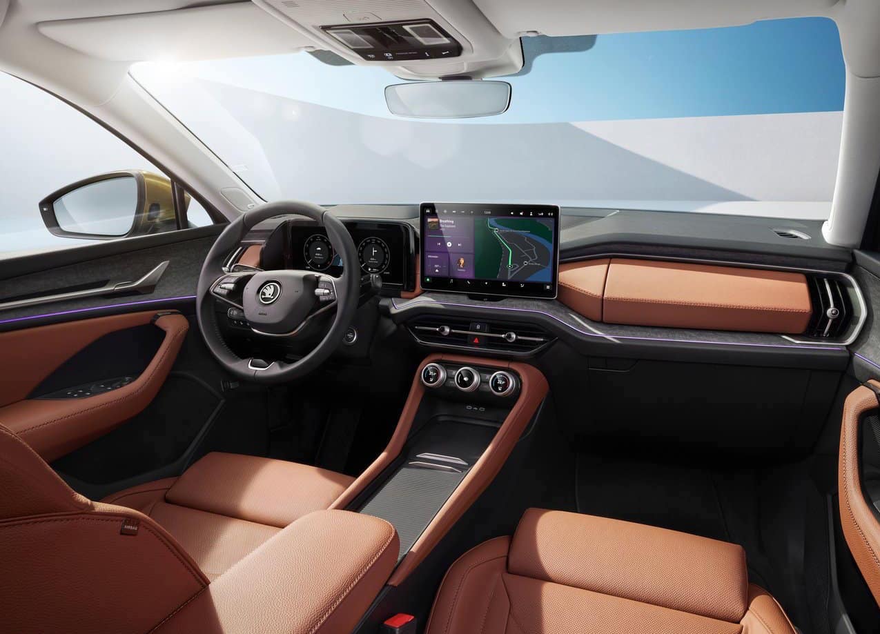 Nội thất của Kodiaq mới được thiết kế hiện đại và tối giản, với màn hình thông tin giải trí kích thước 12.9 inch, đồng hồ kỹ thuật số 10.25 inch và màn hình HUD. Cụm điều khiển trung tâm được bố trí gọn gàng hơn, còn cần số đã được chuyển lên phía sau vô-lăng để tạo không gian thoải mái cho người lái.