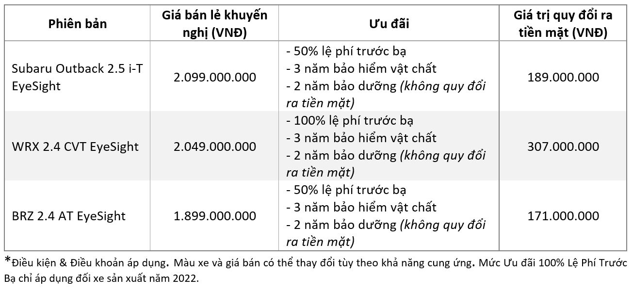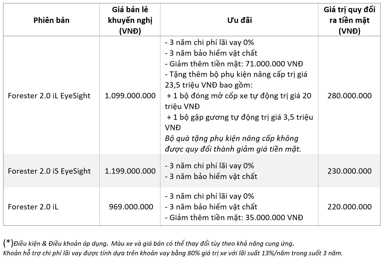 Chi tiết ưu đãi (*) cho từng phiên bản xe Forester như sau: