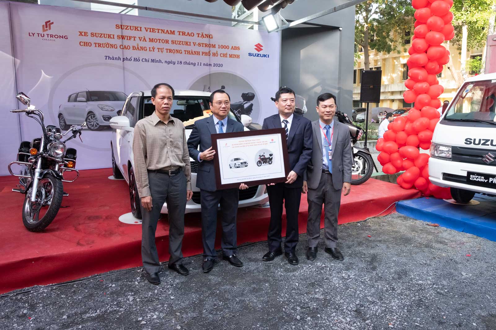 Việt Nam Suzuki (VISUCO) trao tặng 04 xe mô tô và 01 ô tô Swift cho các trường đại học, cao đẳng. Các trường được trao tặng gồm có trường Cao đẳng Lý Tự Trọng TP. Hồ Chí Minh, Cao đẳng kỹ thuật Cao Thắng, Cao đẳng Giao thông vận tải TP. Hồ Chí Minh, và đại học Bách Khoa TP. Hồ Chí Minh.