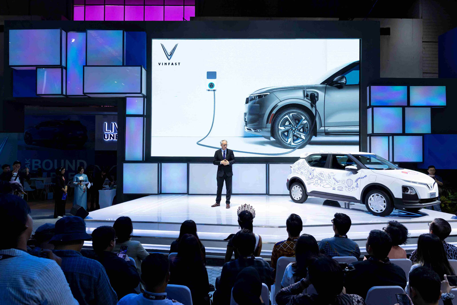 VinFast Auto lần đầu tiên giới thiệu đến thị trường dải xe điện tay lái nghịch trong khuôn khổ sự kiện Triển lãm Ô tô Quốc tế Indonesia (IIMS) 2024. Tại sự kiện, Tổng thống Indonesia Joko Widodo đã tham quan và ký tặng lên mẫu xe VinFast VF 5 trưng bày tại gian hàng của VinFast. Việc chính thức ra mắt thị trường Indonesia đánh dấu bước tiến tiếp theo trong kế hoạch mở rộng toàn cầu của VinFast, đồng thời khẳng định mạnh mẽ cam kết thúc đẩy phát triển giao thông bền vững tại quốc gia vạn đảo và trên toàn cầu.