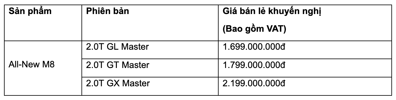 All-New M8 được trang bị động cơ GAC thế hệ thứ tư hiệu suất cao 2.0L tăng áp phun xăng trực tiếp (TGDI), cung cấp công suất tối đa 248 mã lực và mô-men xoắn cực đại 400 Nm. Hộp số trứ danh Aisin (Nhật Bản) tự động 8 cấp mang lại khả năng chuyển số mượt mà và phản hồi nhanh chóng.