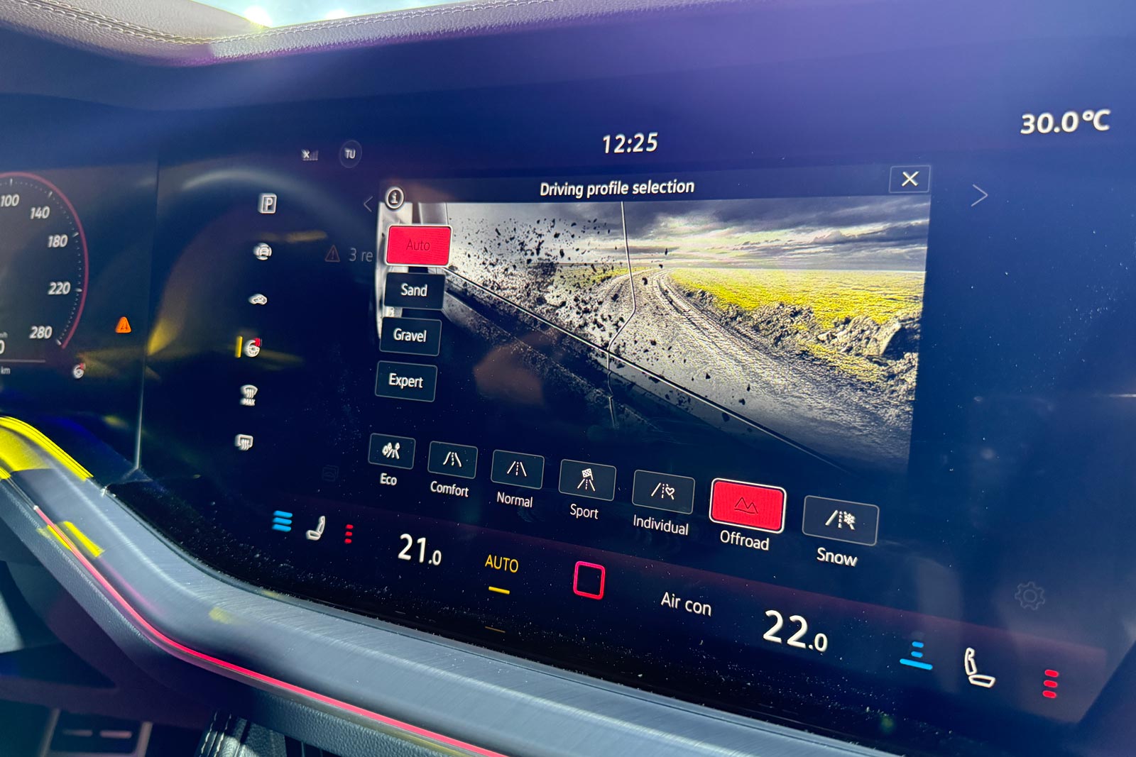 Với các chế độ lái từ On-road (Eco, Comfort, Normal, Sport và Individual) đến Off-road (Snow, Off-road Auto, Sand, Gravel và Off-road Expert), Volkswagen Touareg cho phép người lái tùy chỉnh một cách linh hoạt để phù hợp với mọi điều kiện đường sá, từ đường trường những đến địa hình phức tạp.