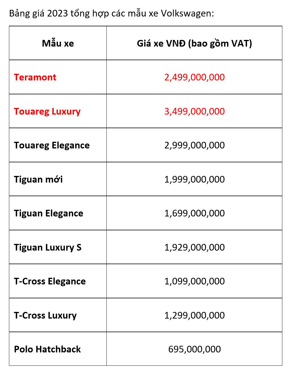 Kể từ ngày 01.01.2023, Volkswagen chính thức điều chỉnh giá mẫu xe Teramont tăng 150 triệu lên mức 2,499 tỷ đồng và giá mẫu xe Touareg Luxury tăng 100 triệu lên mức 3,499 tỷ đồng. Việc có sự điều chỉnh giá bán 2 mẫu xe SUV đầu bảng này là do tỷ giá tăng và lạm phát tăng.