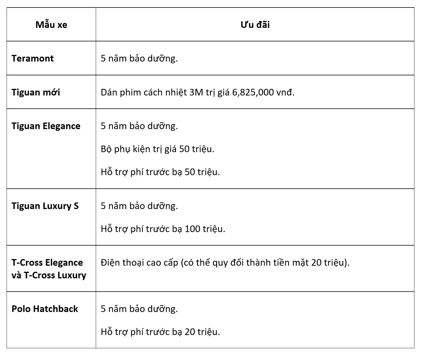 Chương trình ưu đãi dịch vụ giảm 15% cho phụ tùng chính hãng, bao gồm: Dầu động cơ, dầu phanh, lọc dầu động cơ, lọc gió động cơ, lọc gió điều hoà và bugi. Chương trình ưu đãi dịch vụ diễn ra từ nay đến 25.12.2022. Chương trình áp dụng tại hệ thống đại lý chính hãng Volkswagen trên toàn quốc.